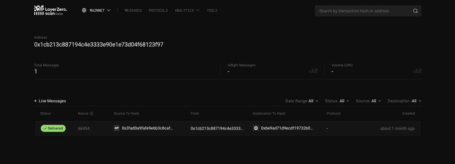 If that wasn’t sucessful, please search user’s wallet address on LayerZero explorer.A message appears with Ordelry as a destination chain for any deposits we have received.